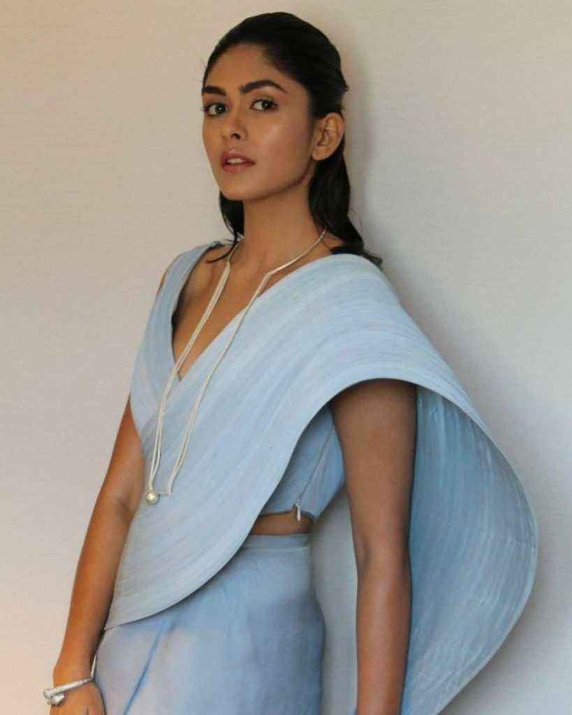 Home > Cinema > வித்தியாசமான ட்ரஸ்ஸில் 360 டிகிரியும் சுத்தி சுத்தி காட்டி போஸ் கொடுத்த மிருனாள் தாக்கூர்!