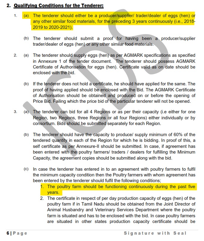 குறைந்தபட்சம் 3 வருடங்களுக்கு டெண்டர் கோரும் நிறுவனம் முட்டை சப்ளை செய்து இருக்க வேண்டும். கோழி பண்ணை குறைந்தபட்சம் 5 ஆண்டுகள் இயங்கி இருக்க வேண்டும். அக்மார்க் தரசான்று,FSSAI License போன்றவை இருக்க வேண்டும் RTI மூலம் தகவல் கேட்டதில் நான்கு மண்டலத்திலும் டெண்டரில் பங்கு பெற்ற நிறுவனங்களும் அவர்கள் கோரிய விலையும் உங்கள் பார்வைக்கு இணைத்துள்ளேன்.