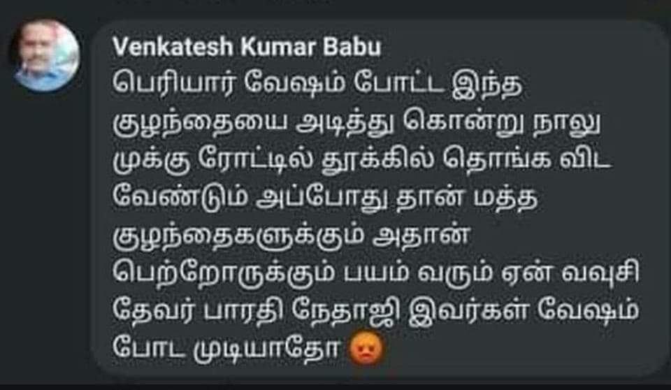 அப்போது தான் மற்ற குழந்தைகளுக்கு பயம் வரும். பெற்றோருக்கும் பயம்வரும், ஏன் வ.உ.சி. நேதாஜி தேவர் பாரதி வேஷம் போடமுடியாதோ” என பதிவிட்டிருந்தார். இதையடுத்து அவர்மீது புகார் தெரிவிக்கப்பட்டது. அதன்பின்னர் அவர் குழந்தைகளுக்கு கொலைமிரட்டல் விடுத்ததாக கைது செய்யப்பட்டுள்ளார். குழந்தைகளுக்கு கொலை மிரட்டல் விடுத்த இவர் மீது கடும் நடவடிக்கை எடுக்கவேண்டும் என்பதே மக்களின் எதிர்பார்ப்பு.